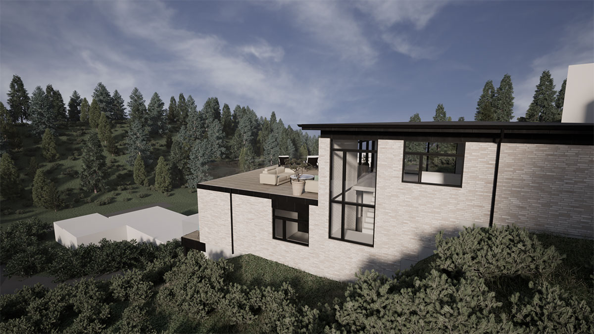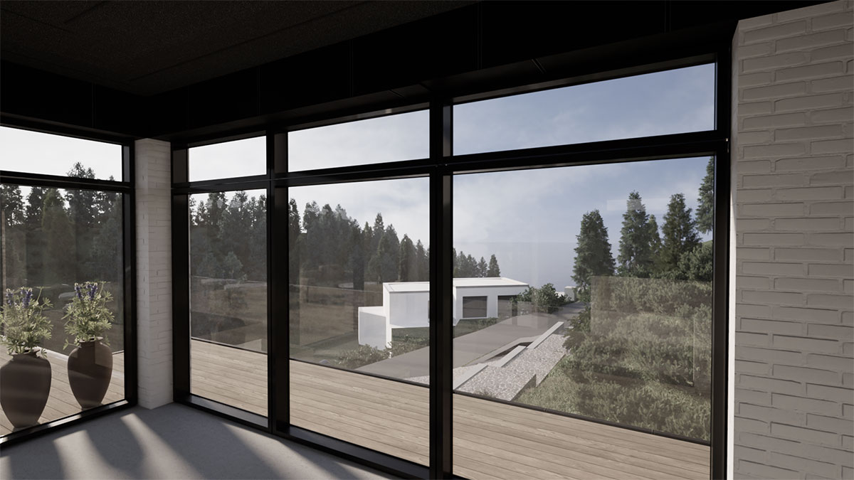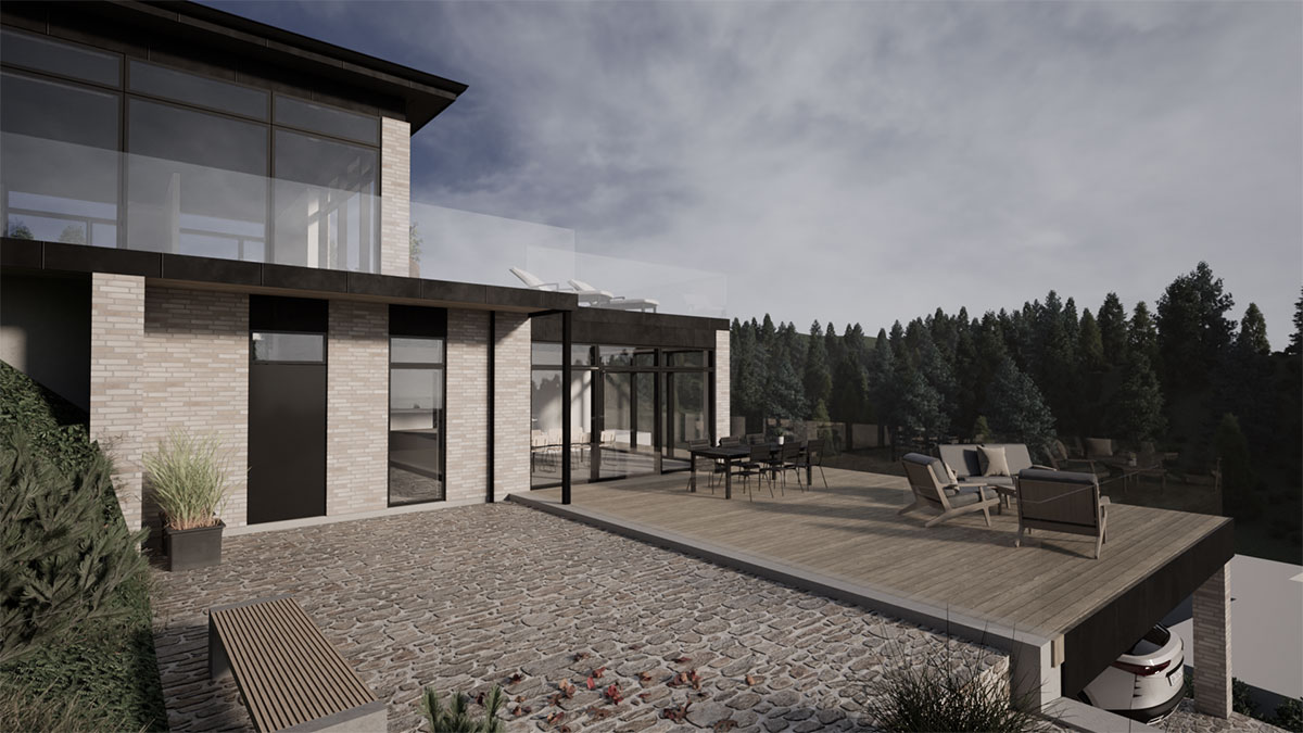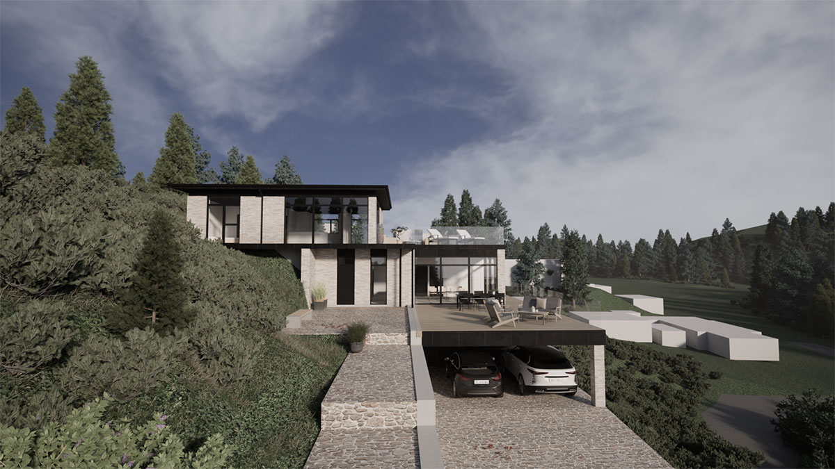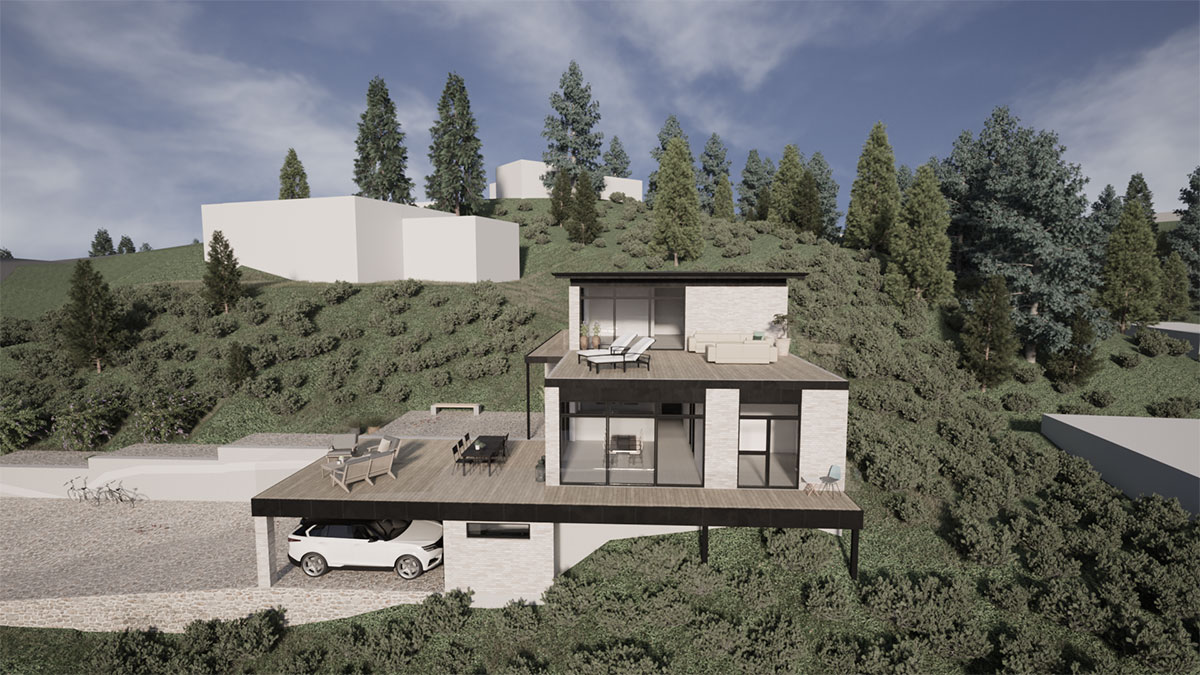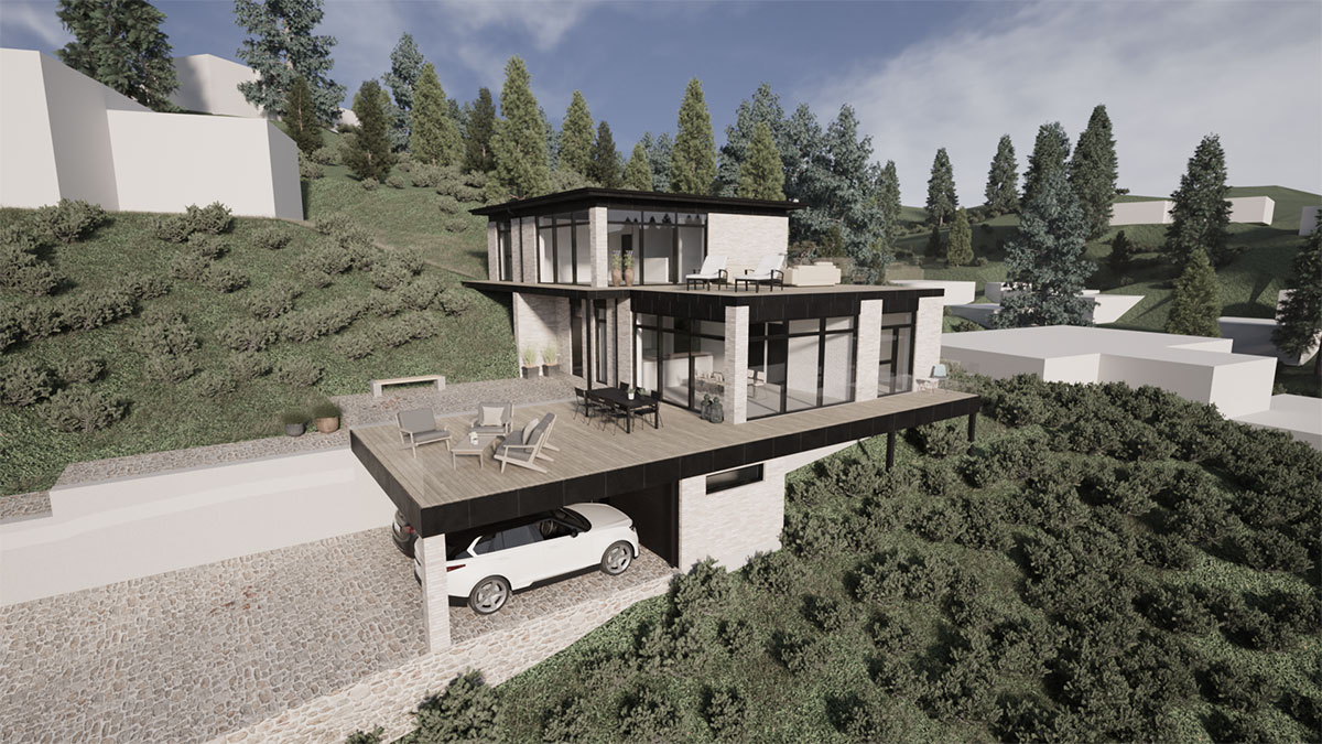 Arkitekttegnet villa i de skønneste naturomgivelser. Huset er lavet på en skråning, hvilket stiller ekstra krav til ingeniørens tværfaglige ekspertise.